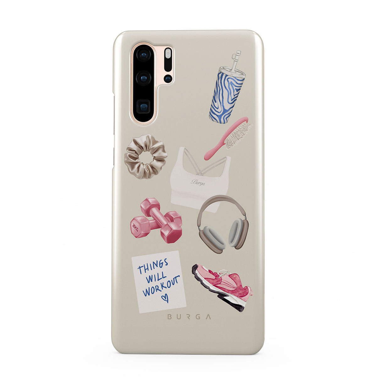 このデザインの特徴:、ダンベル、ヘッドフォン、タンブラー、ヘアブラシ、ピンクのスニーカー、スポーツブラ、クランチーバー、「Things Will Work Out」付箋が含まれています。