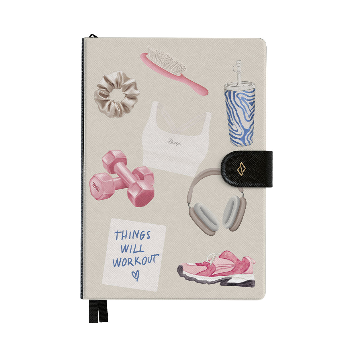 このデザインの特徴:、ダンベル、ヘッドフォン、タンブラー、ヘアブラシ、ピンクのスニーカー、スポーツブラ、クランチーバー、「Things Will Work Out」付箋が含まれています。