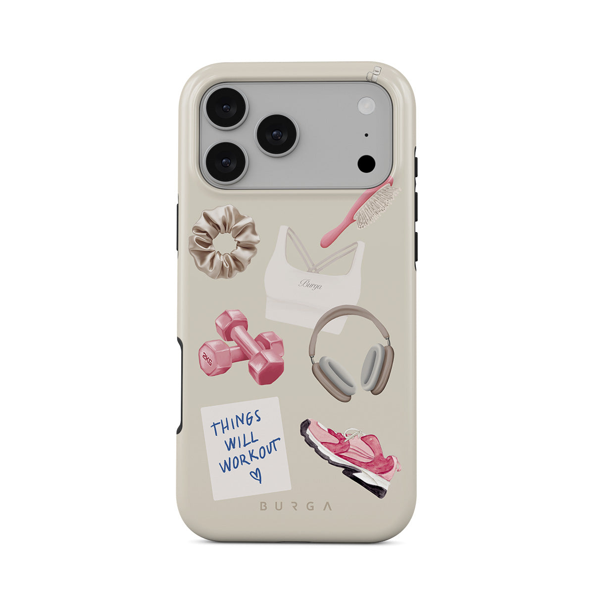 このデザインの特徴:、ダンベル、ヘッドフォン、タンブラー、ヘアブラシ、ピンクのスニーカー、スポーツブラ、クランチーバー、「Things Will Work Out」付箋が含まれています。
