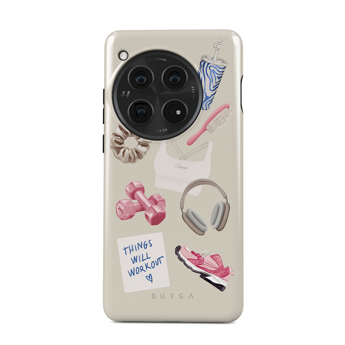 このデザインの特徴:、ダンベル、ヘッドフォン、タンブラー、ヘアブラシ、ピンクのスニーカー、スポーツブラ、クランチーバー、「Things Will Work Out」付箋が含まれています。
