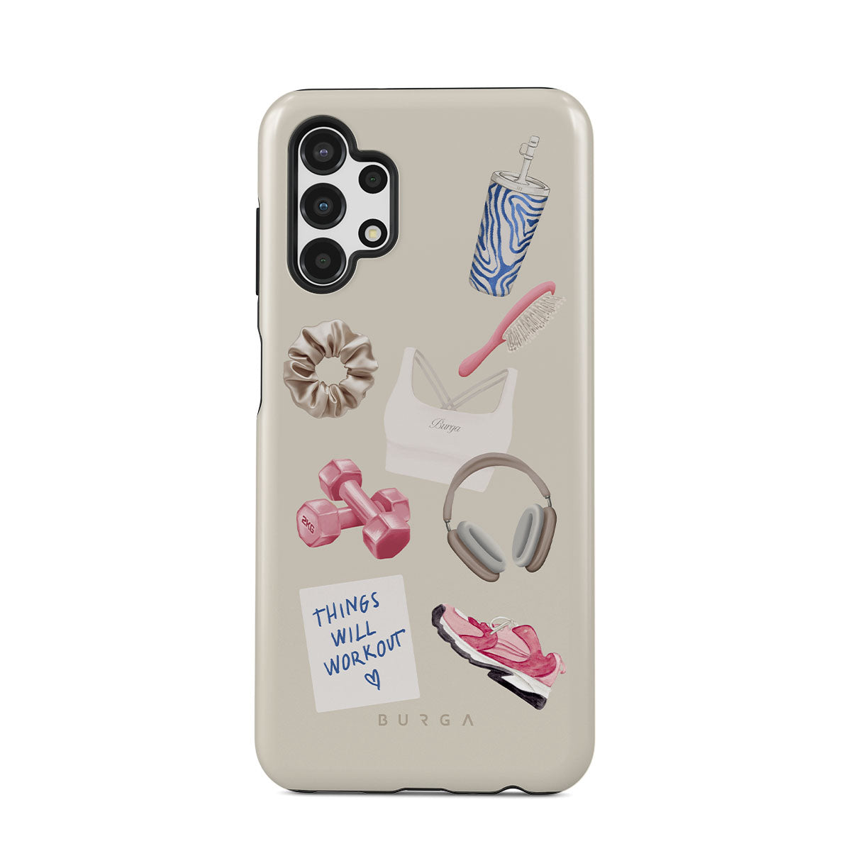 このデザインの特徴:、ダンベル、ヘッドフォン、タンブラー、ヘアブラシ、ピンクのスニーカー、スポーツブラ、クランチーバー、「Things Will Work Out」付箋が含まれています。