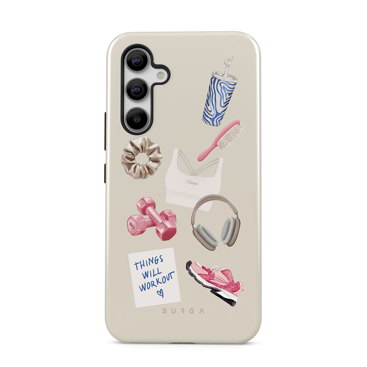 このデザインの特徴:、ダンベル、ヘッドフォン、タンブラー、ヘアブラシ、ピンクのスニーカー、スポーツブラ、クランチーバー、「Things Will Work Out」付箋が含まれています。