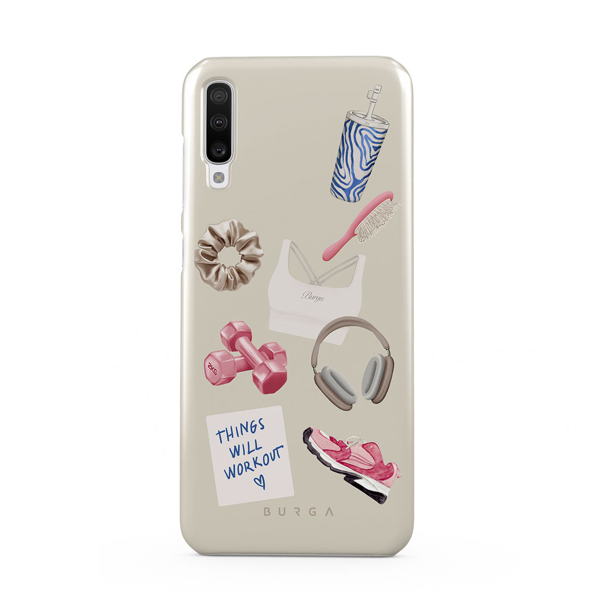 このデザインの特徴:、ダンベル、ヘッドフォン、タンブラー、ヘアブラシ、ピンクのスニーカー、スポーツブラ、クランチーバー、「Things Will Work Out」付箋が含まれています。