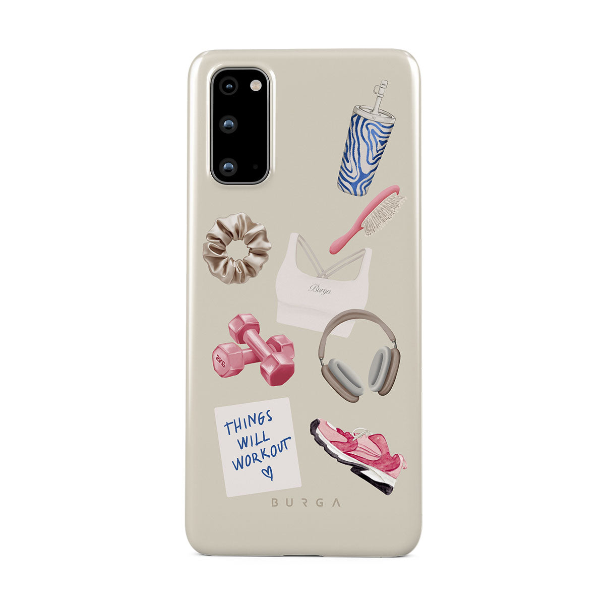 このデザインの特徴:、ダンベル、ヘッドフォン、タンブラー、ヘアブラシ、ピンクのスニーカー、スポーツブラ、クランチーバー、「Things Will Work Out」付箋が含まれています。