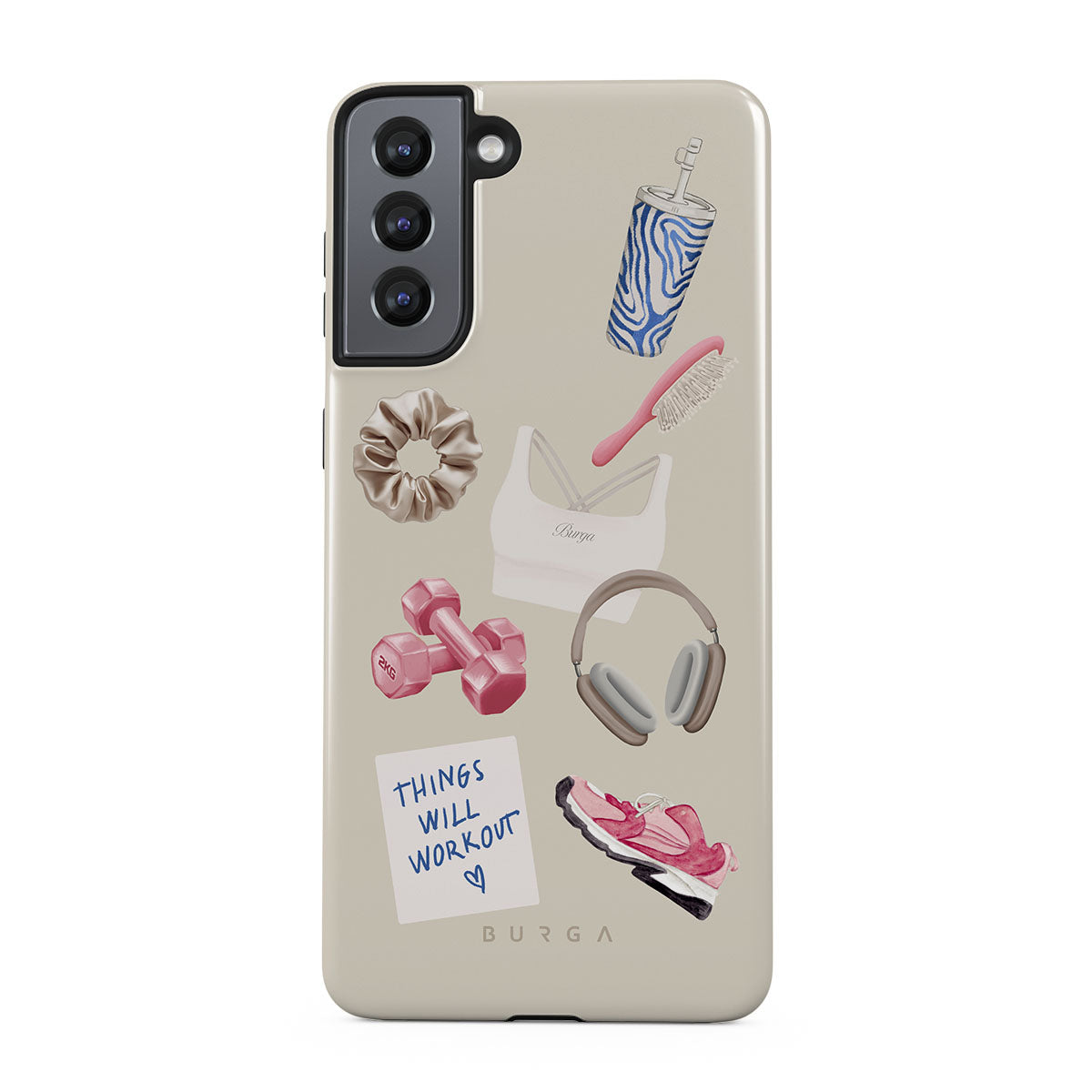 このデザインの特徴:、ダンベル、ヘッドフォン、タンブラー、ヘアブラシ、ピンクのスニーカー、スポーツブラ、クランチーバー、「Things Will Work Out」付箋が含まれています。