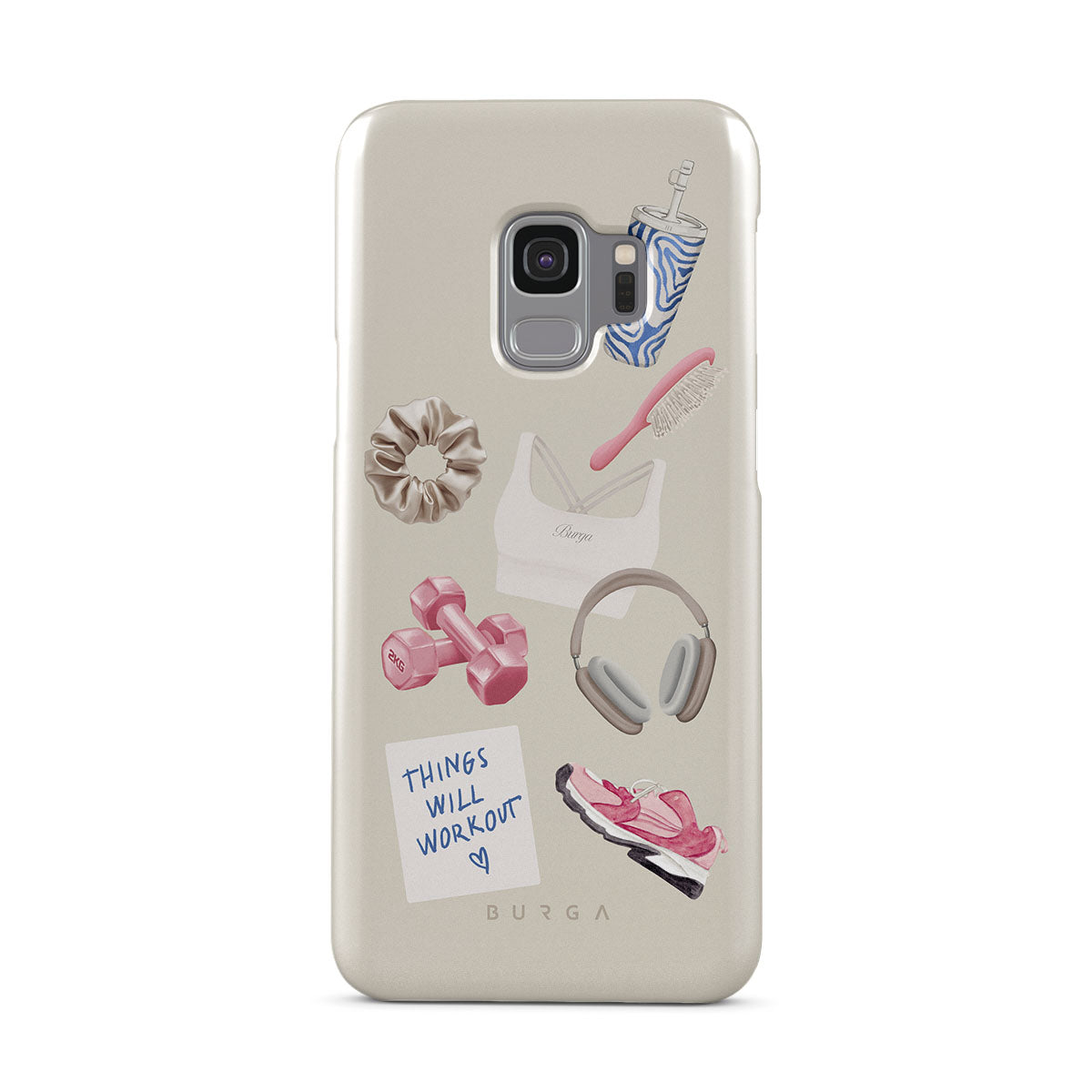 このデザインの特徴:、ダンベル、ヘッドフォン、タンブラー、ヘアブラシ、ピンクのスニーカー、スポーツブラ、クランチーバー、「Things Will Work Out」付箋が含まれています。