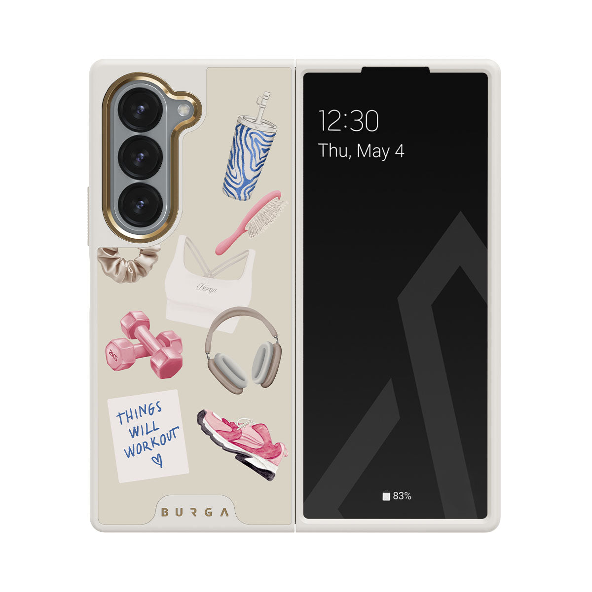 このデザインの特徴:、ダンベル、ヘッドフォン、タンブラー、ヘアブラシ、ピンクのスニーカー、スポーツブラ、クランチーバー、「Things Will Work Out」付箋が含まれています。