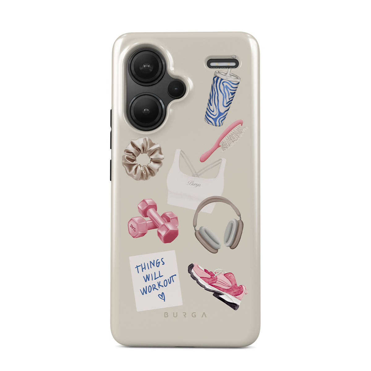 このデザインの特徴:、ダンベル、ヘッドフォン、タンブラー、ヘアブラシ、ピンクのスニーカー、スポーツブラ、クランチーバー、「Things Will Work Out」付箋が含まれています。