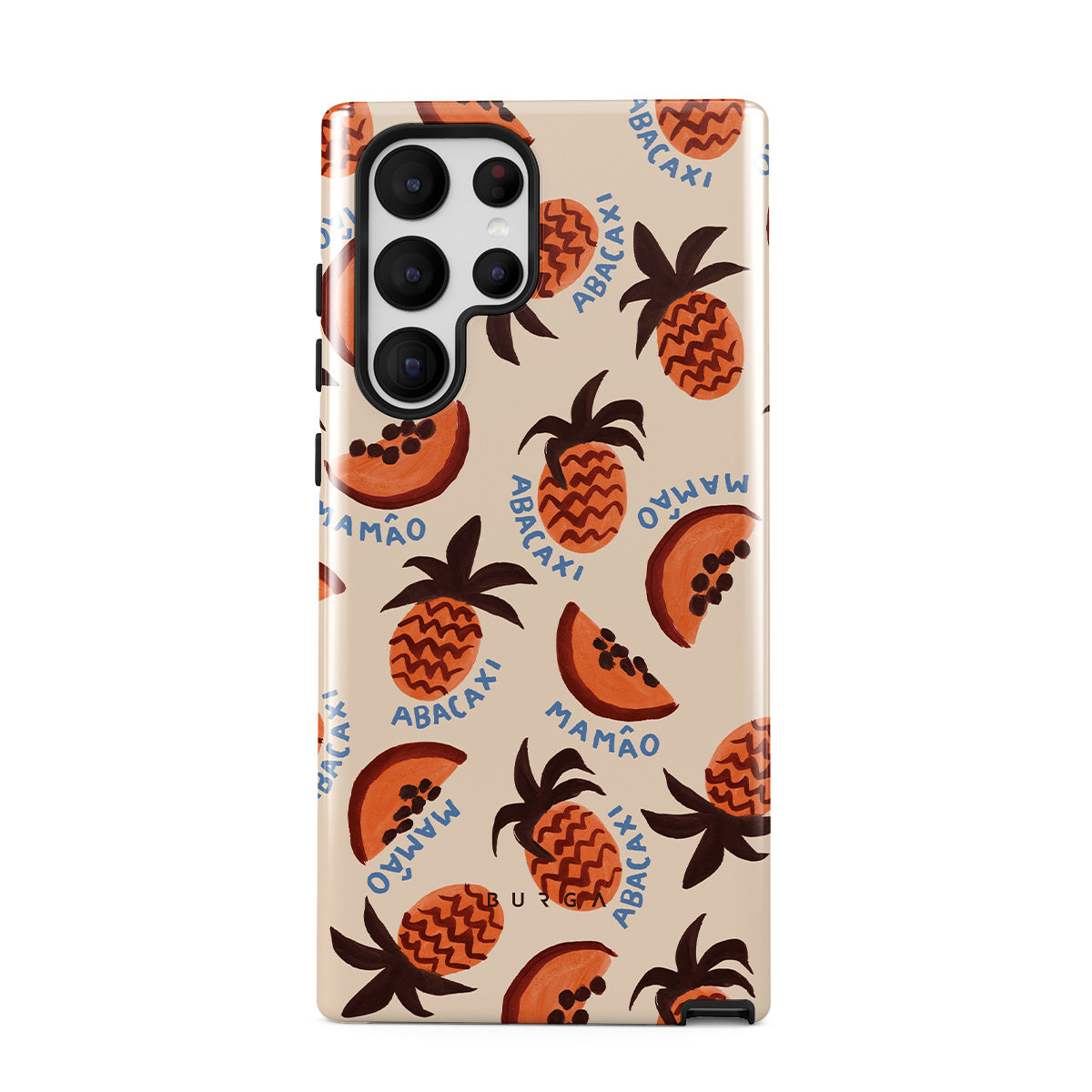 このデザインの特徴:パイナップルとパパイヤの果物、トロピカルパターン
