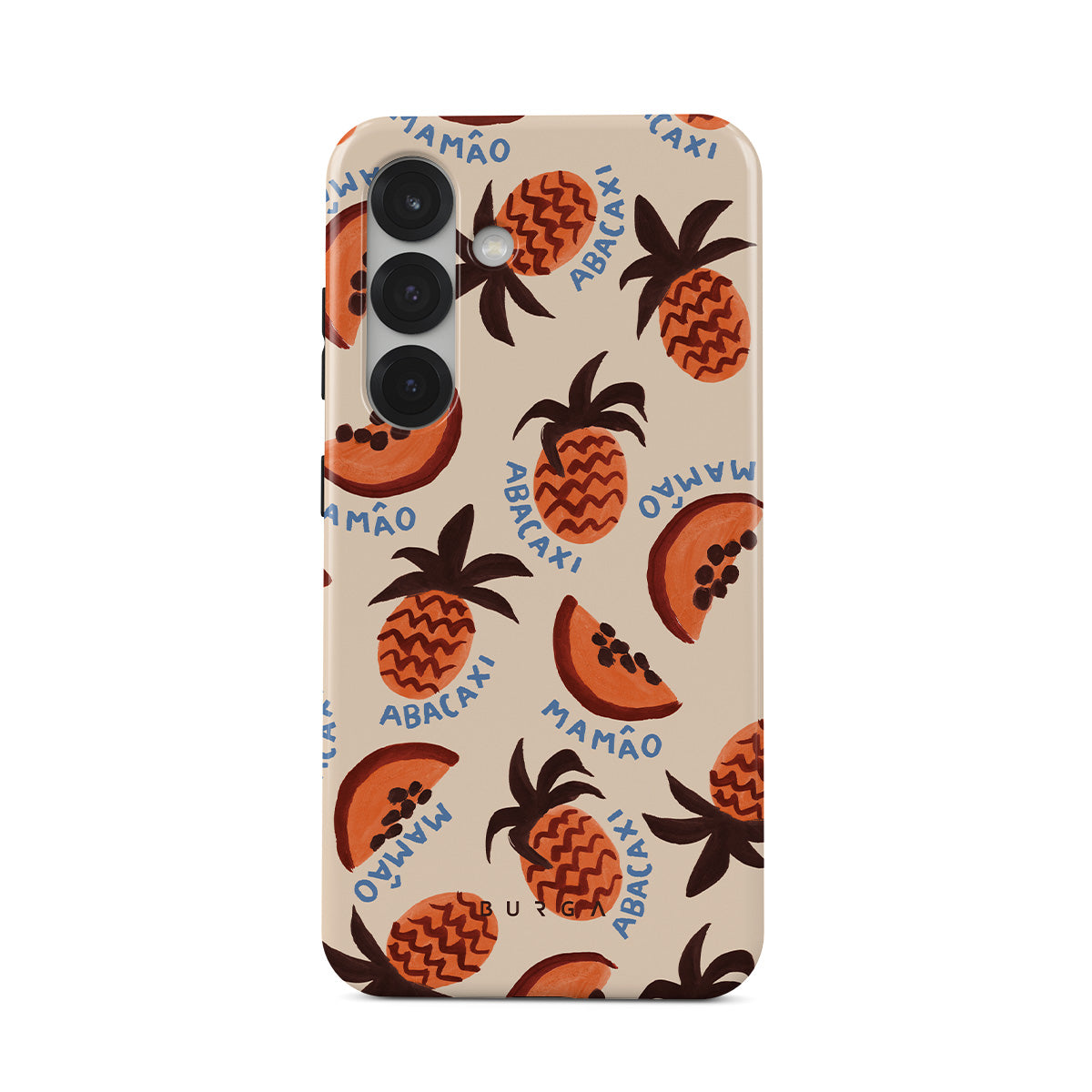 このデザインの特徴:パイナップルとパパイヤの果物、トロピカルパターン