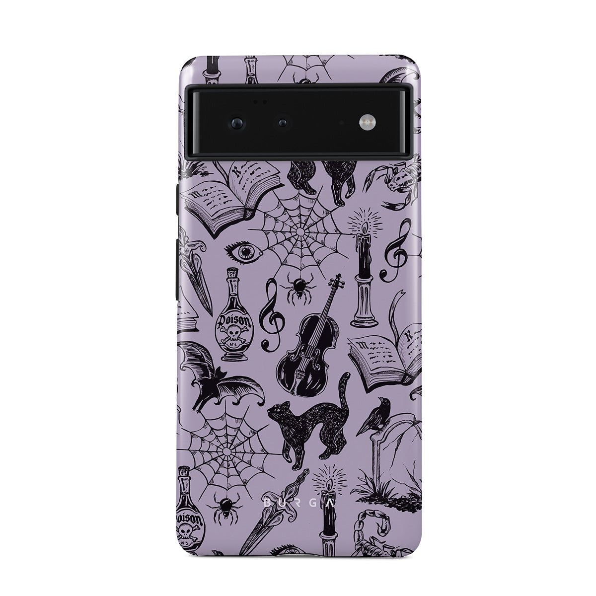 このデザインの特徴:ゴシックな落書き、神秘的な要素、クモ、クモの巣、猫、バイオリン、目、キャンドル、短剣、本、コウモリ、カラス、サソリ