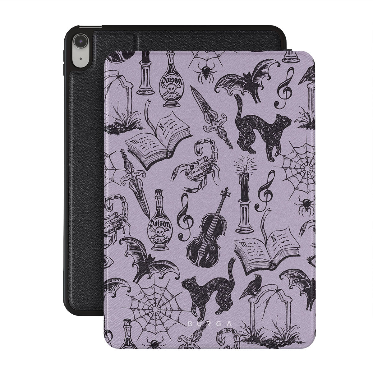 このデザインの特徴:ゴシックな落書き、神秘的な要素、クモ、クモの巣、猫、バイオリン、目、キャンドル、短剣、本、コウモリ、カラス、サソリ