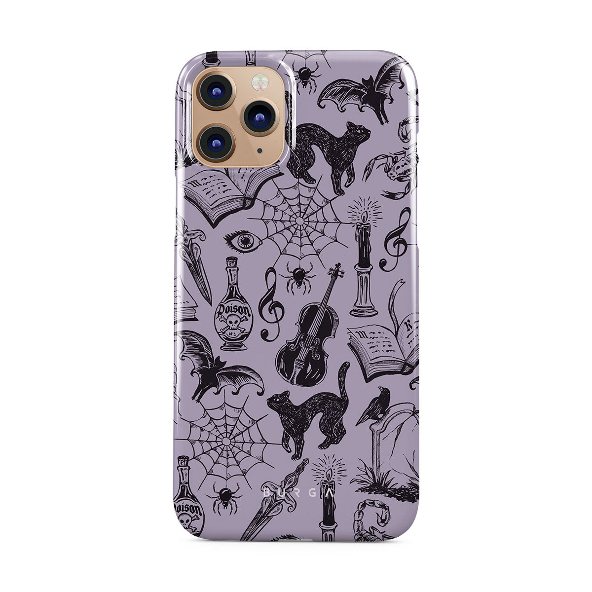 このデザインの特徴:ゴシックな落書き、神秘的な要素、クモ、クモの巣、猫、バイオリン、目、キャンドル、短剣、本、コウモリ、カラス、サソリ