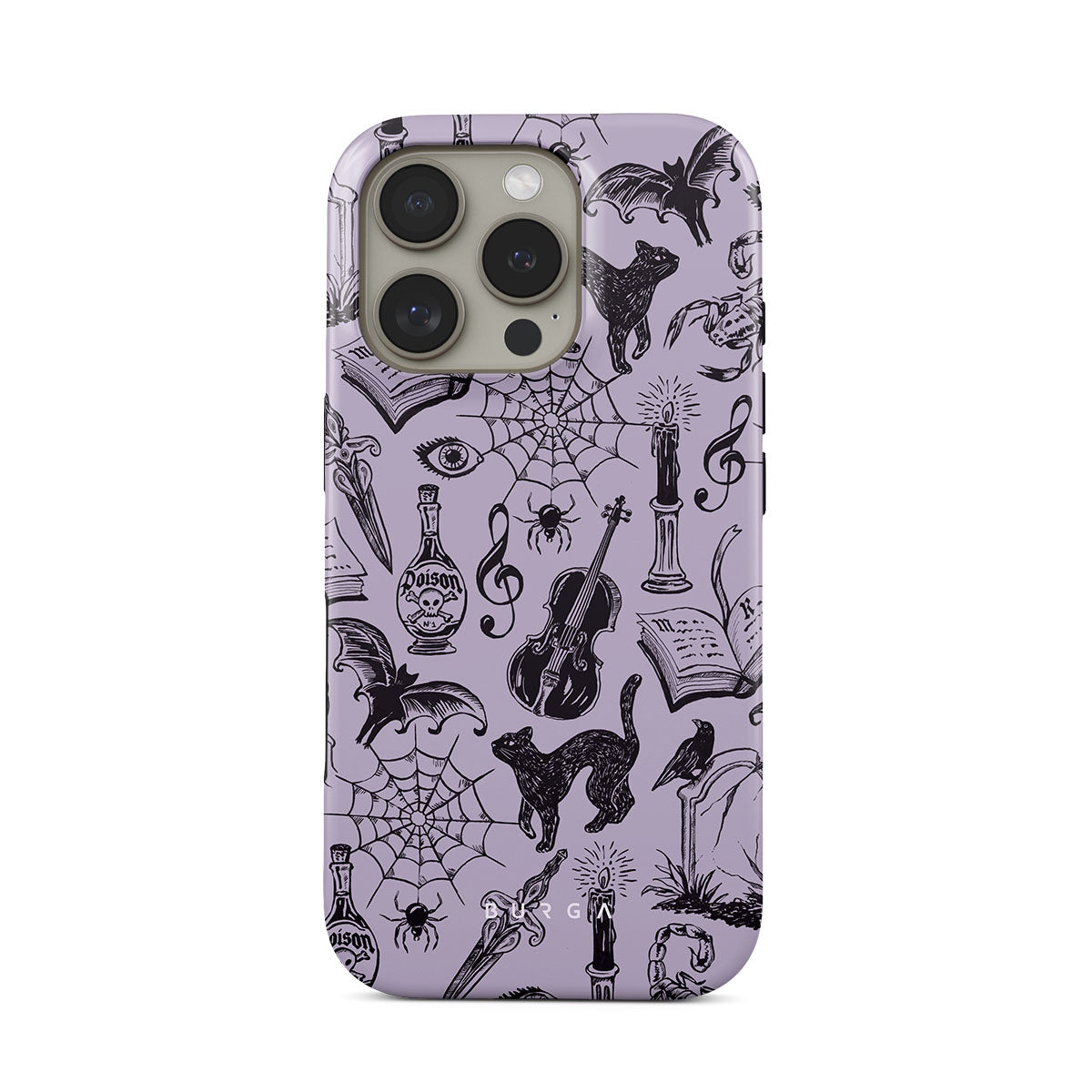 このデザインの特徴:ゴシックな落書き、神秘的な要素、クモ、クモの巣、猫、バイオリン、目、キャンドル、短剣、本、コウモリ、カラス、サソリ