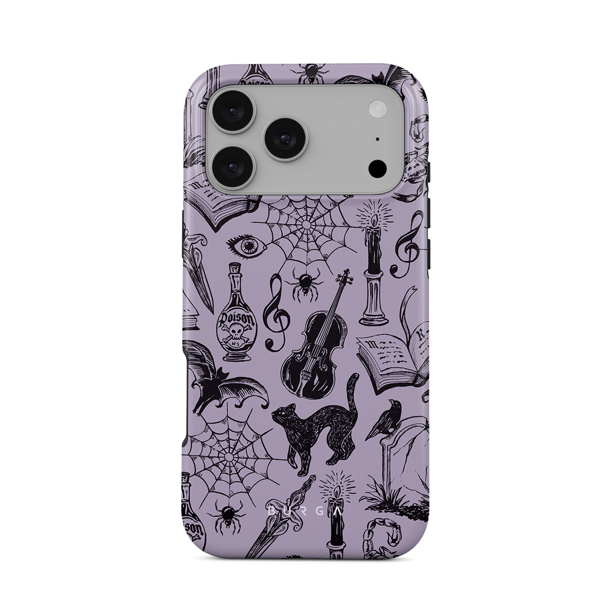 このデザインの特徴:ゴシックな落書き、神秘的な要素、クモ、クモの巣、猫、バイオリン、目、キャンドル、短剣、本、コウモリ、カラス、サソリ