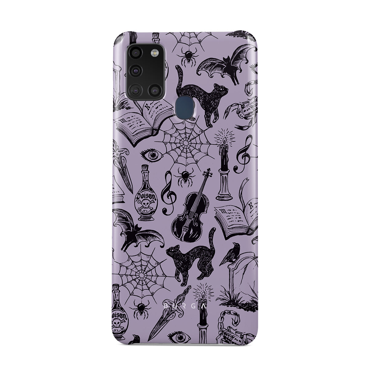 このデザインの特徴:ゴシックな落書き、神秘的な要素、クモ、クモの巣、猫、バイオリン、目、キャンドル、短剣、本、コウモリ、カラス、サソリ