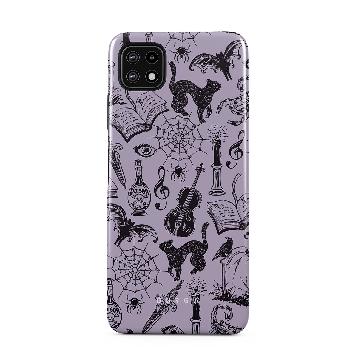 このデザインの特徴:ゴシックな落書き、神秘的な要素、クモ、クモの巣、猫、バイオリン、目、キャンドル、短剣、本、コウモリ、カラス、サソリ