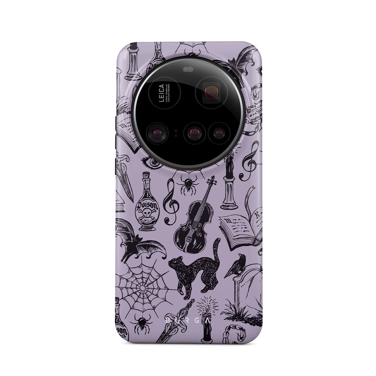 このデザインの特徴:ゴシックな落書き、神秘的な要素、クモ、クモの巣、猫、バイオリン、目、キャンドル、短剣、本、コウモリ、カラス、サソリ