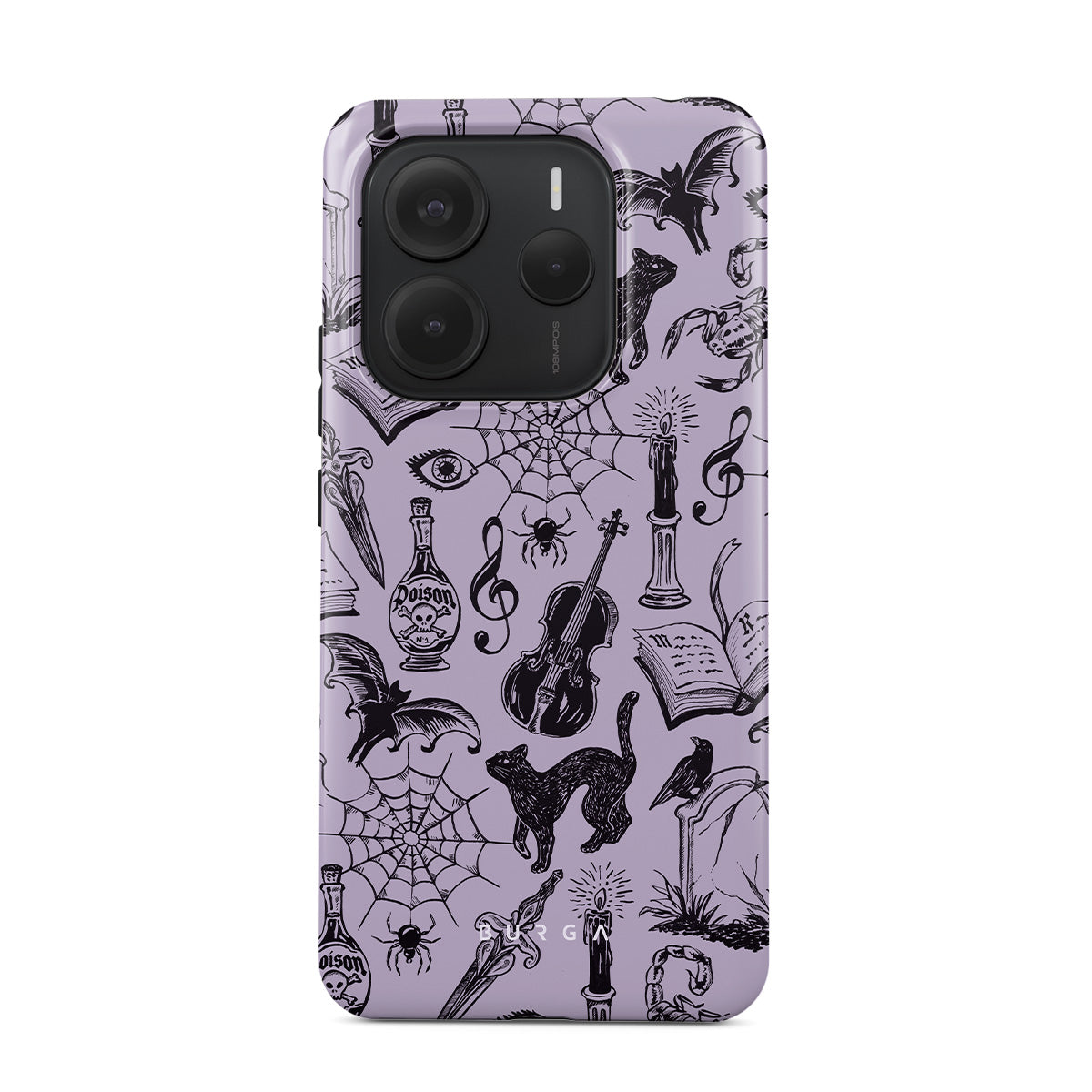 このデザインの特徴:ゴシックな落書き、神秘的な要素、クモ、クモの巣、猫、バイオリン、目、キャンドル、短剣、本、コウモリ、カラス、サソリ