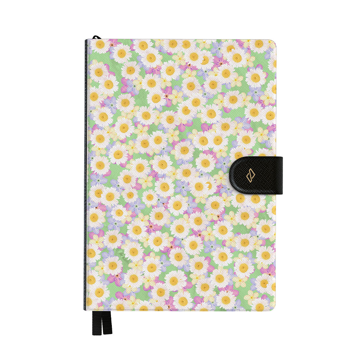 日付が書かれていないミニマリストなデザインで、手帳・スケジュール帳・ダイアリーとして使えます。表紙のハードカバーには、心地よい手触りのヴィーガンサフィアーノレザーを使用。スリムな磁気べえると付きの頑丈な手帳で、コーヒーをこぼしたり、うっかり手帳を落としたりしても安心です。