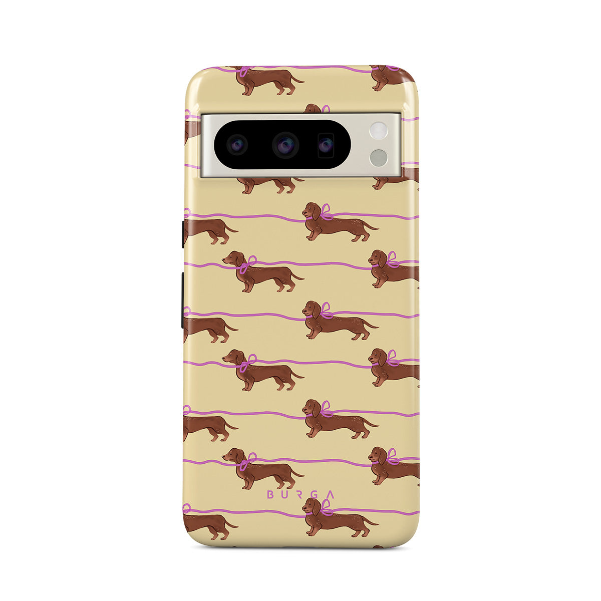 このデザインの特徴:ピンクのリボンをつけたダックスフンドなどの可愛い犬が描かれています。