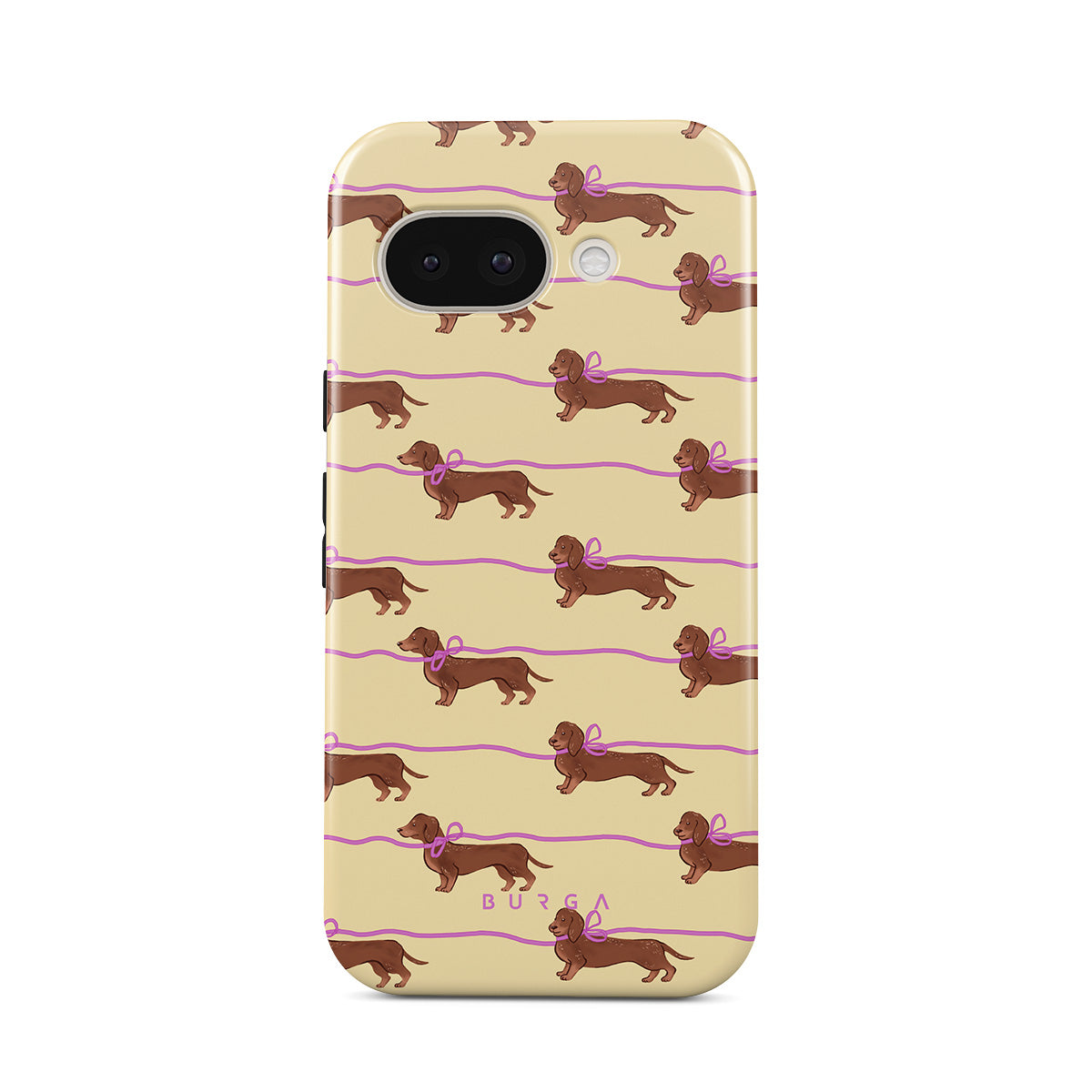 このデザインの特徴:ピンクのリボンをつけたダックスフンドなどの可愛い犬が描かれています。