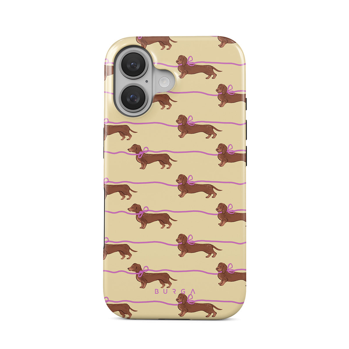 このデザインの特徴:ピンクのリボンをつけたダックスフンドなどの可愛い犬が描かれています。