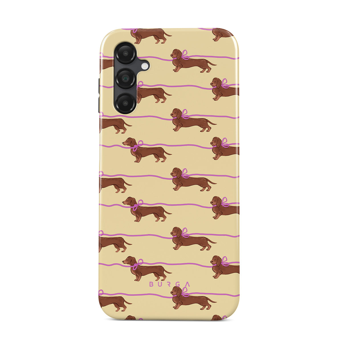 このデザインの特徴:ピンクのリボンをつけたダックスフンドなどの可愛い犬が描かれています。