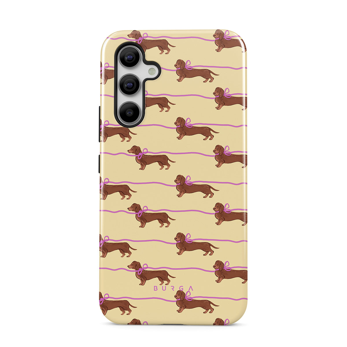 このデザインの特徴:ピンクのリボンをつけたダックスフンドなどの可愛い犬が描かれています。
