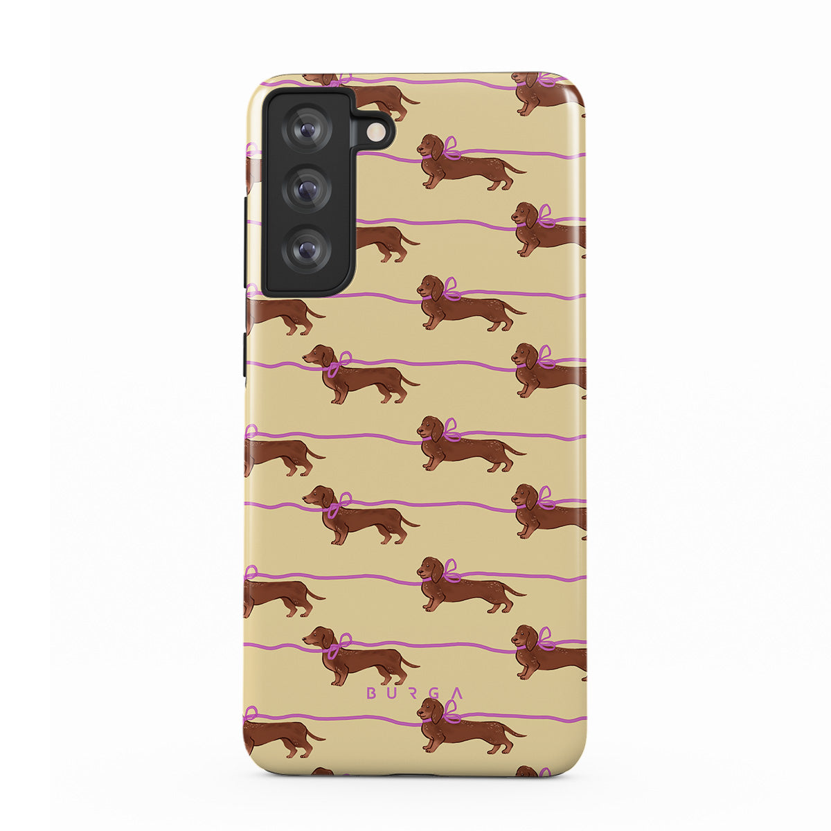 このデザインの特徴:ピンクのリボンをつけたダックスフンドなどの可愛い犬が描かれています。