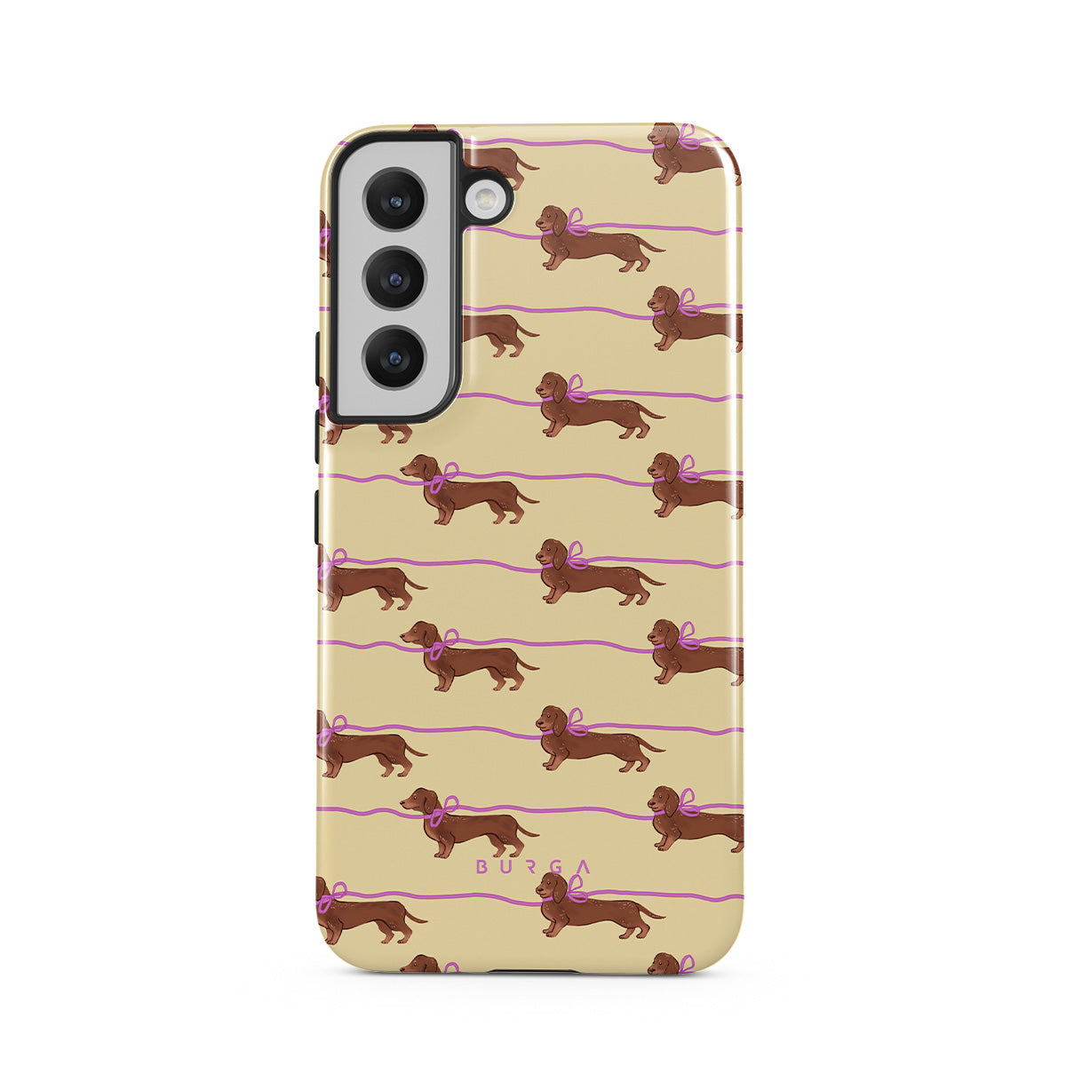 このデザインの特徴:ピンクのリボンをつけたダックスフンドなどの可愛い犬が描かれています。