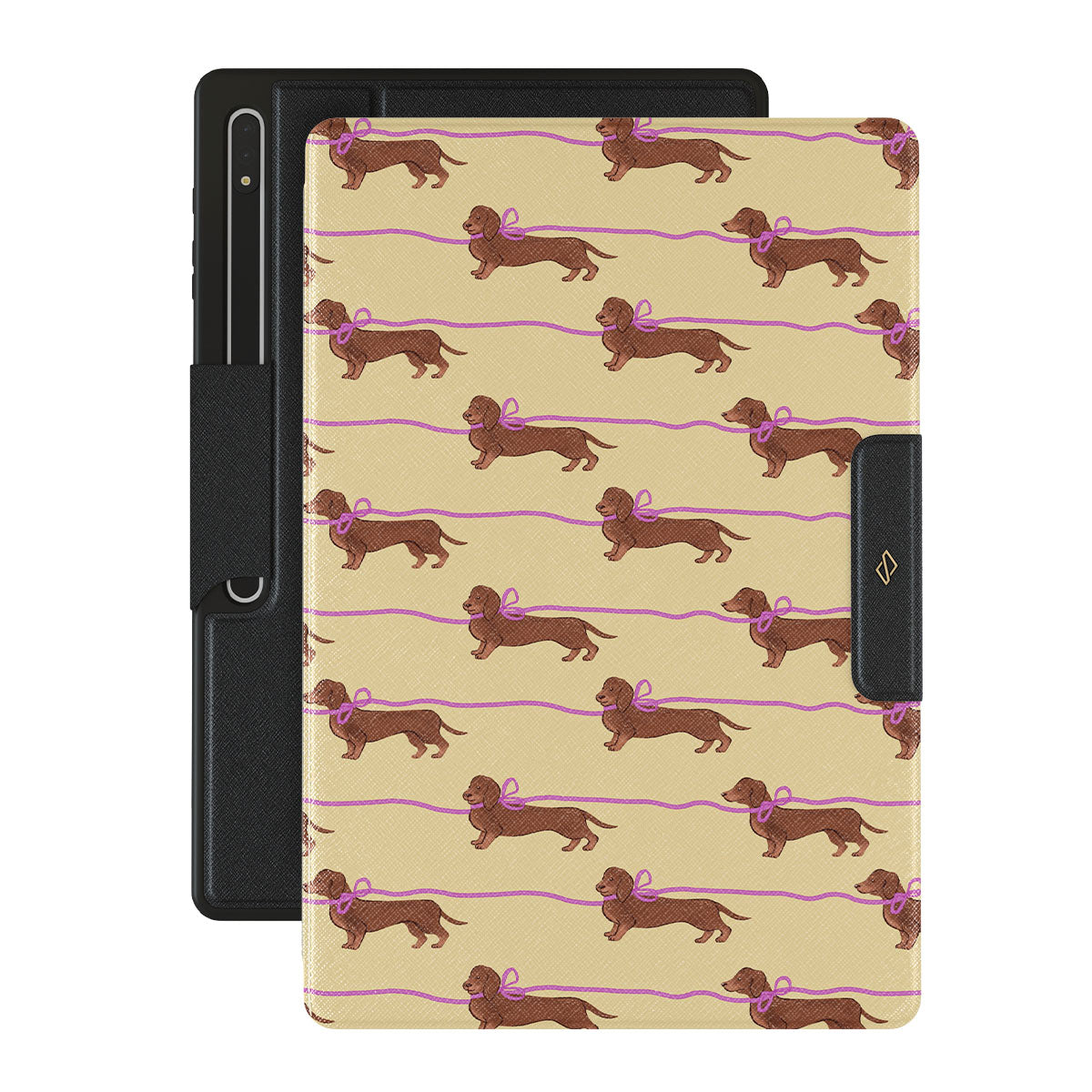 このデザインの特徴:ピンクのリボンをつけたダックスフンドなどの可愛い犬が描かれています。
