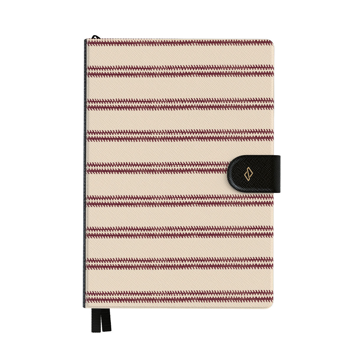 日付が書かれていないミニマリストなデザインで、手帳・スケジュール帳・ダイアリーとして使えます。表紙のハードカバーには、心地よい手触りのヴィーガンサフィアーノレザーを使用。スリムな磁気べえると付きの頑丈な手帳で、コーヒーをこぼしたり、うっかり手帳を落としたりしても安心です。