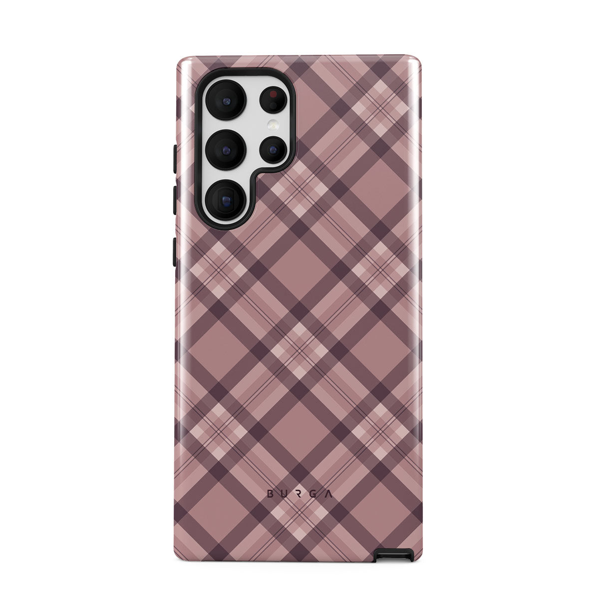 このデザインの特徴:ピンクとグレーの格子柄、チェック柄