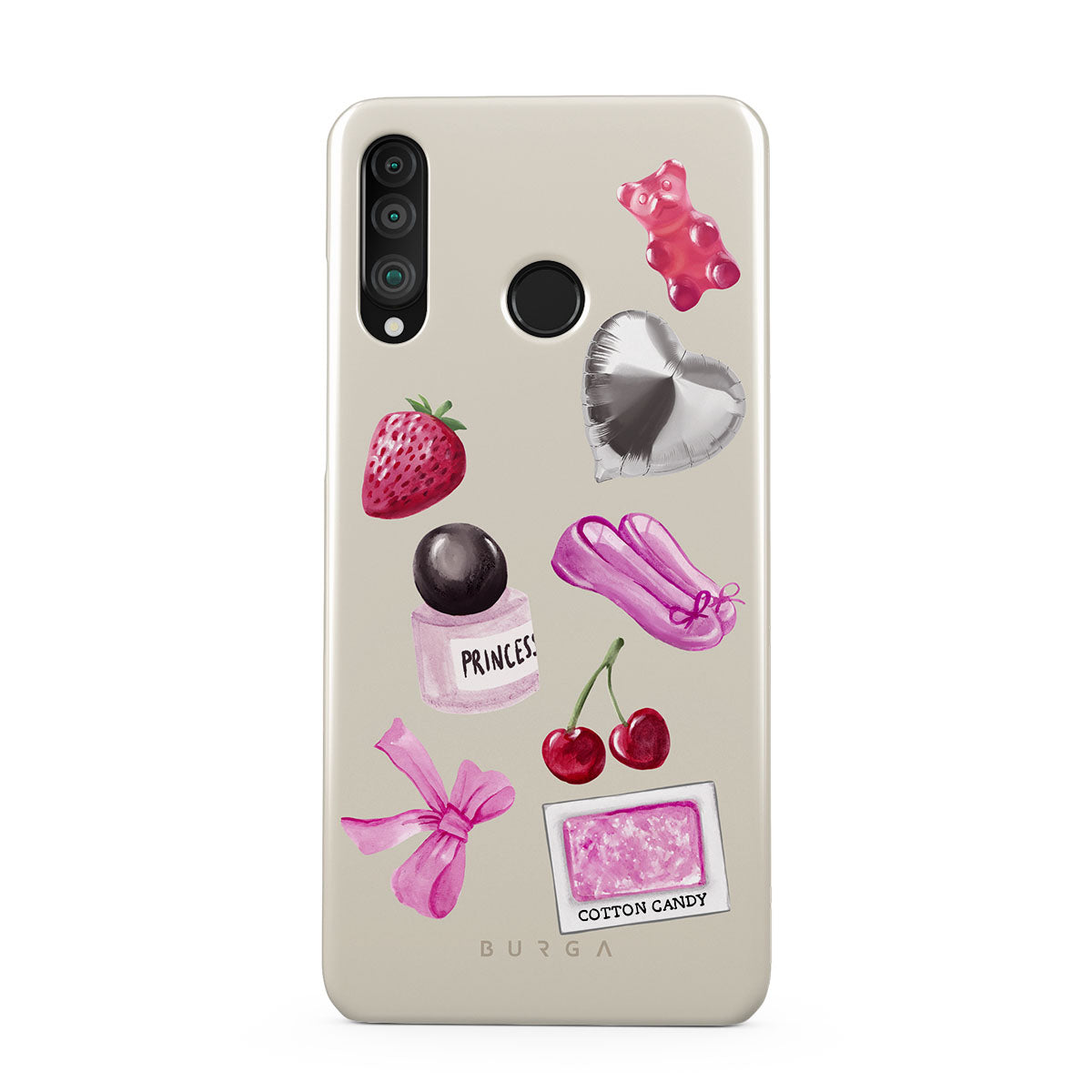 このデザインの特徴:、ピンクのリボン、ハート型のシルバーバルーン、香水ボトル、イチゴ、さくらんぼ、ピンクのバレエシューズ、綿あめステッカー、ピンクのグミベアが含まれています。
