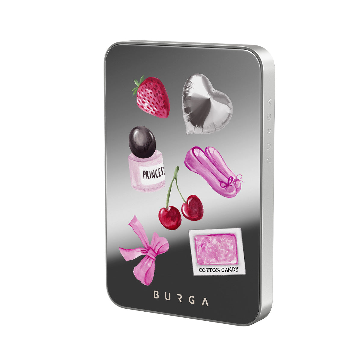 このデザインの特徴:、ピンクのリボン、ハート型のシルバーバルーン、香水ボトル、イチゴ、さくらんぼ、ピンクのバレエシューズ、綿あめステッカー、ピンクのグミベアが含まれています。