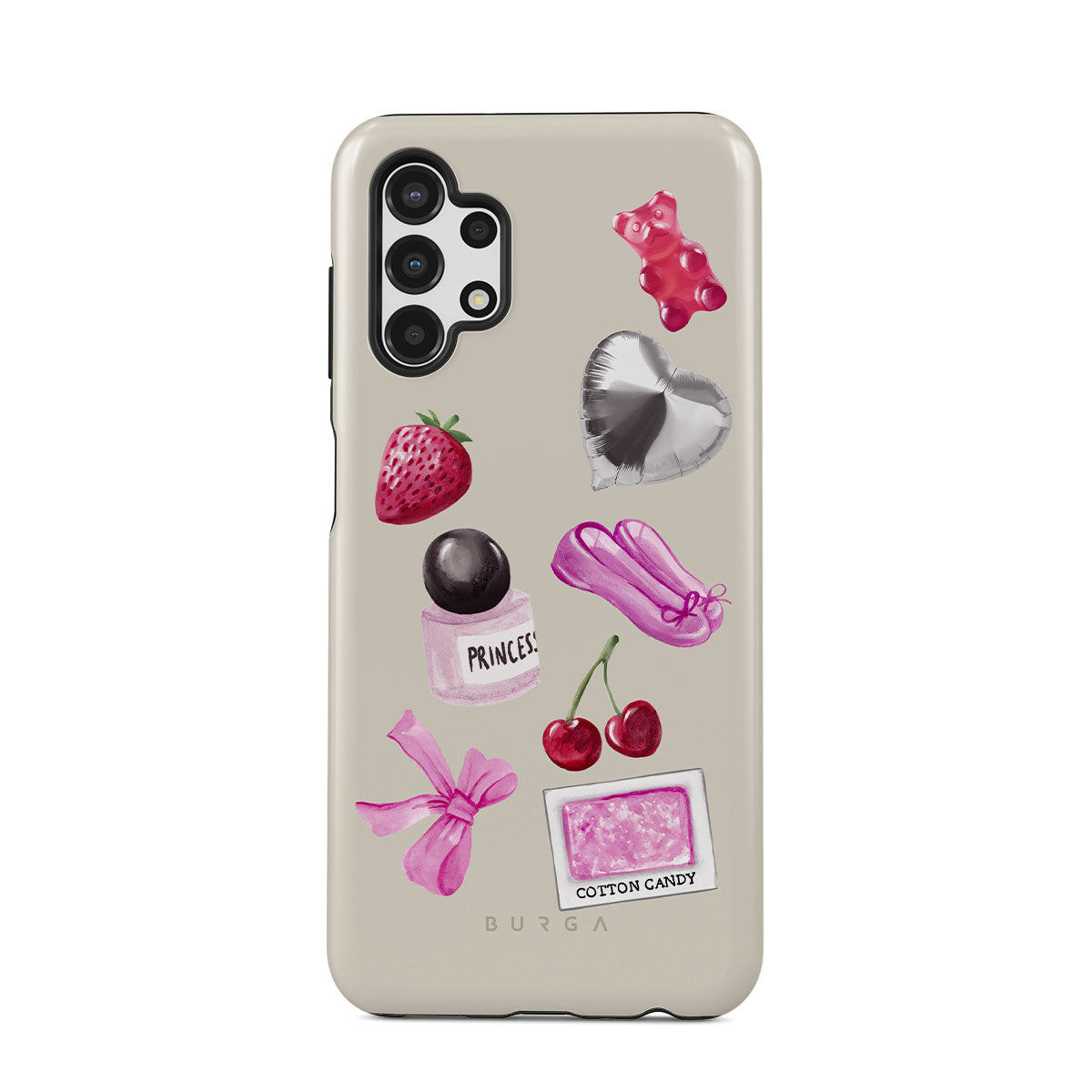 このデザインの特徴:、ピンクのリボン、ハート型のシルバーバルーン、香水ボトル、イチゴ、さくらんぼ、ピンクのバレエシューズ、綿あめステッカー、ピンクのグミベアが含まれています。