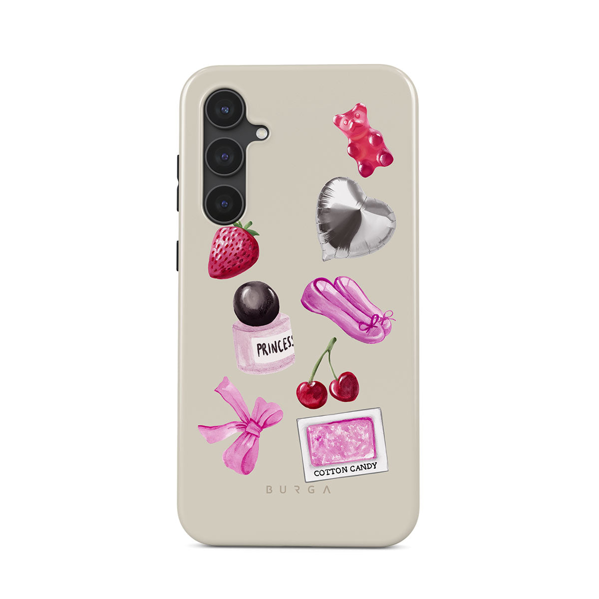 このデザインの特徴:、ピンクのリボン、ハート型のシルバーバルーン、香水ボトル、イチゴ、さくらんぼ、ピンクのバレエシューズ、綿あめステッカー、ピンクのグミベアが含まれています。