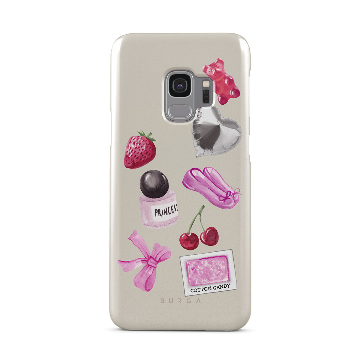 このデザインの特徴:、ピンクのリボン、ハート型のシルバーバルーン、香水ボトル、イチゴ、さくらんぼ、ピンクのバレエシューズ、綿あめステッカー、ピンクのグミベアが含まれています。