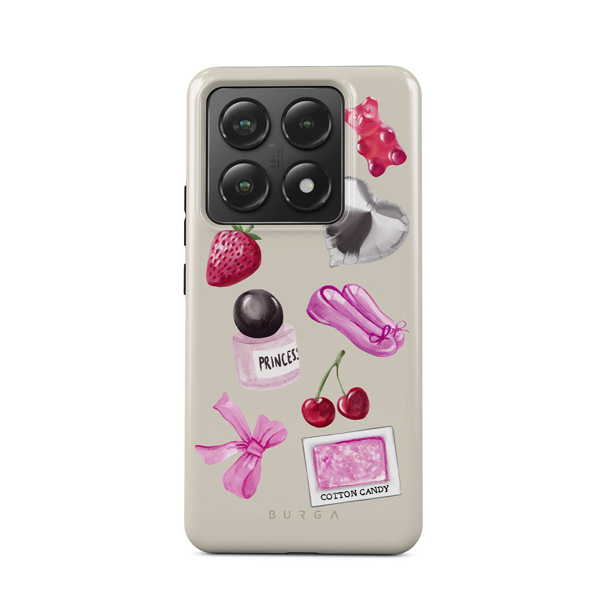 このデザインの特徴:、ピンクのリボン、ハート型のシルバーバルーン、香水ボトル、イチゴ、さくらんぼ、ピンクのバレエシューズ、綿あめステッカー、ピンクのグミベアが含まれています。
