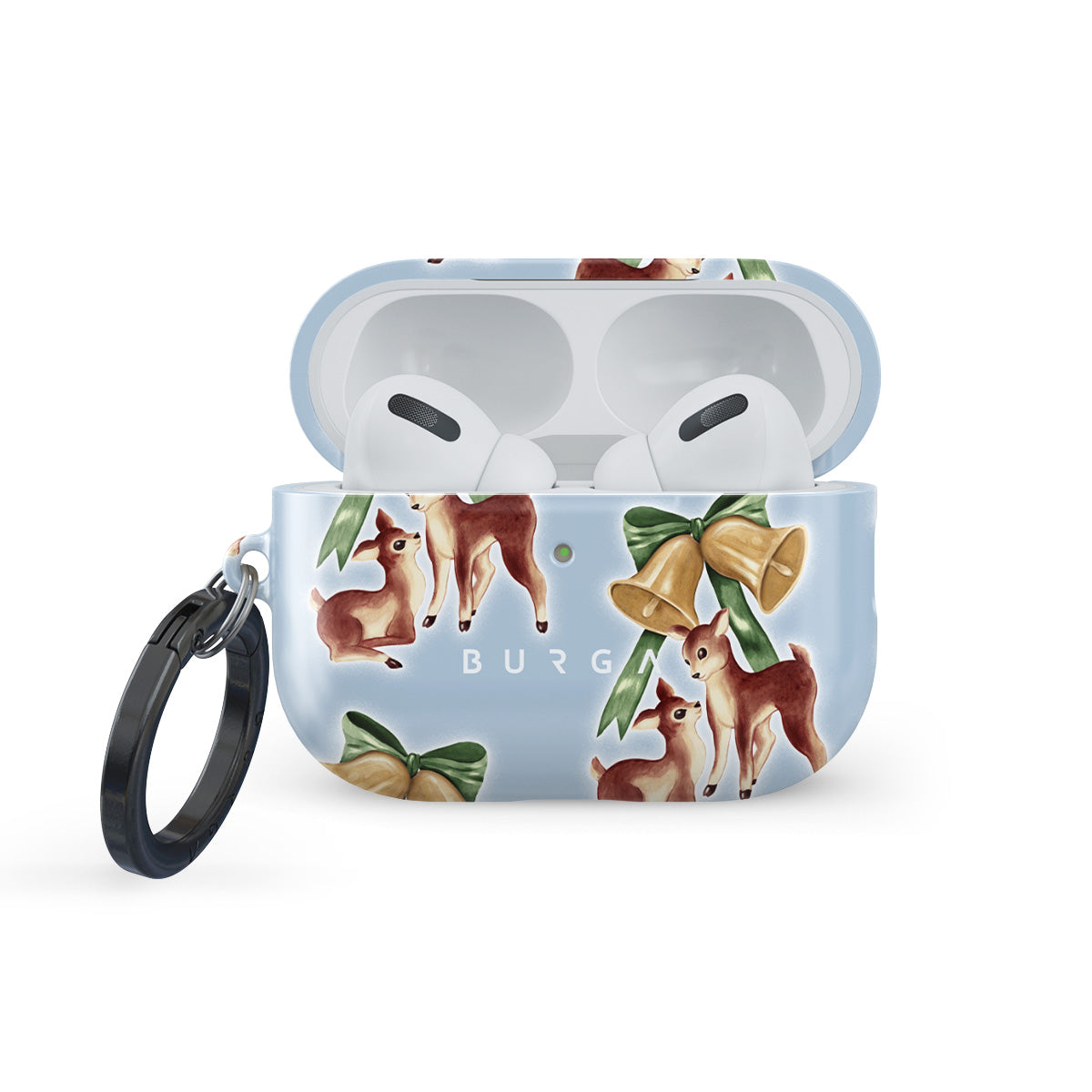 このデザインの特徴:ヴィンテージのトナカイ、クリスマスベル、金色のベル、レトロなトナカイのイラスト、ベビーディア、ライトブルーの背景