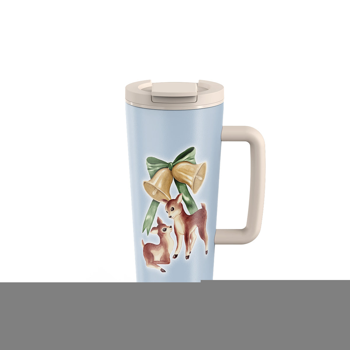 このデザインの特徴:ヴィンテージのトナカイ、クリスマスベル、金色のベル、レトロなトナカイのイラスト、ベビーディア、ライトブルーの背景