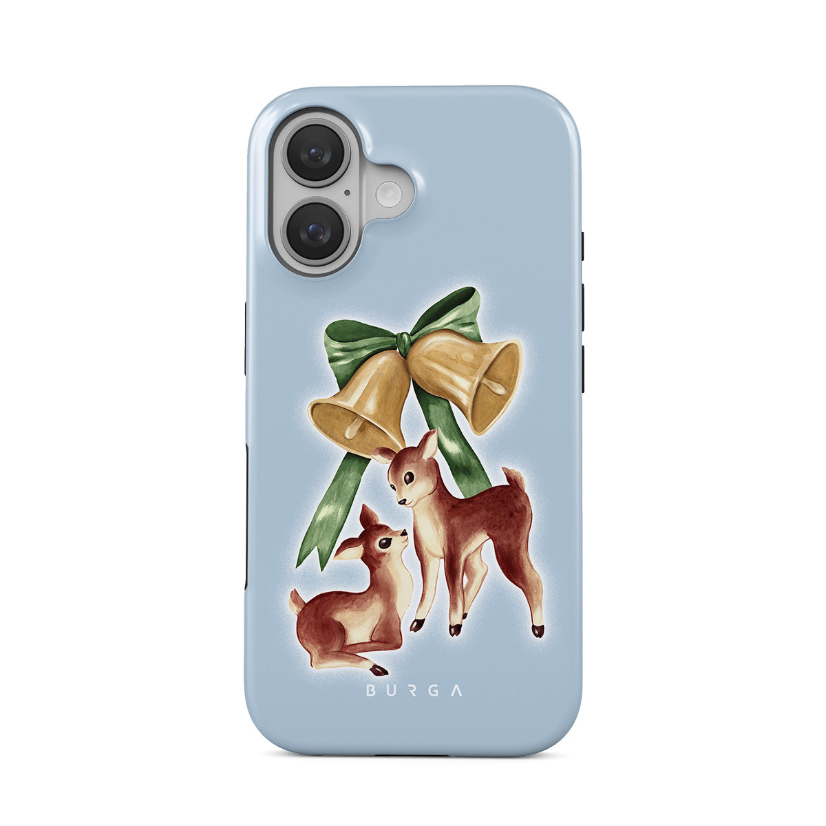 このデザインの特徴:ヴィンテージのトナカイ、クリスマスベル、金色のベル、レトロなトナカイのイラスト、ベビーディア、ライトブルーの背景
