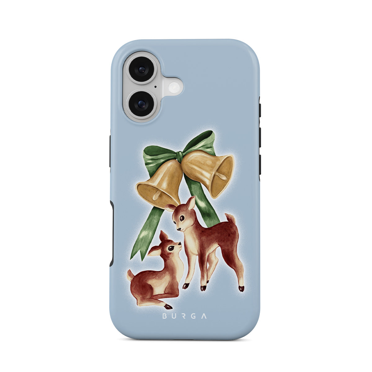 このデザインの特徴:ヴィンテージのトナカイ、クリスマスベル、金色のベル、レトロなトナカイのイラスト、ベビーディア、ライトブルーの背景