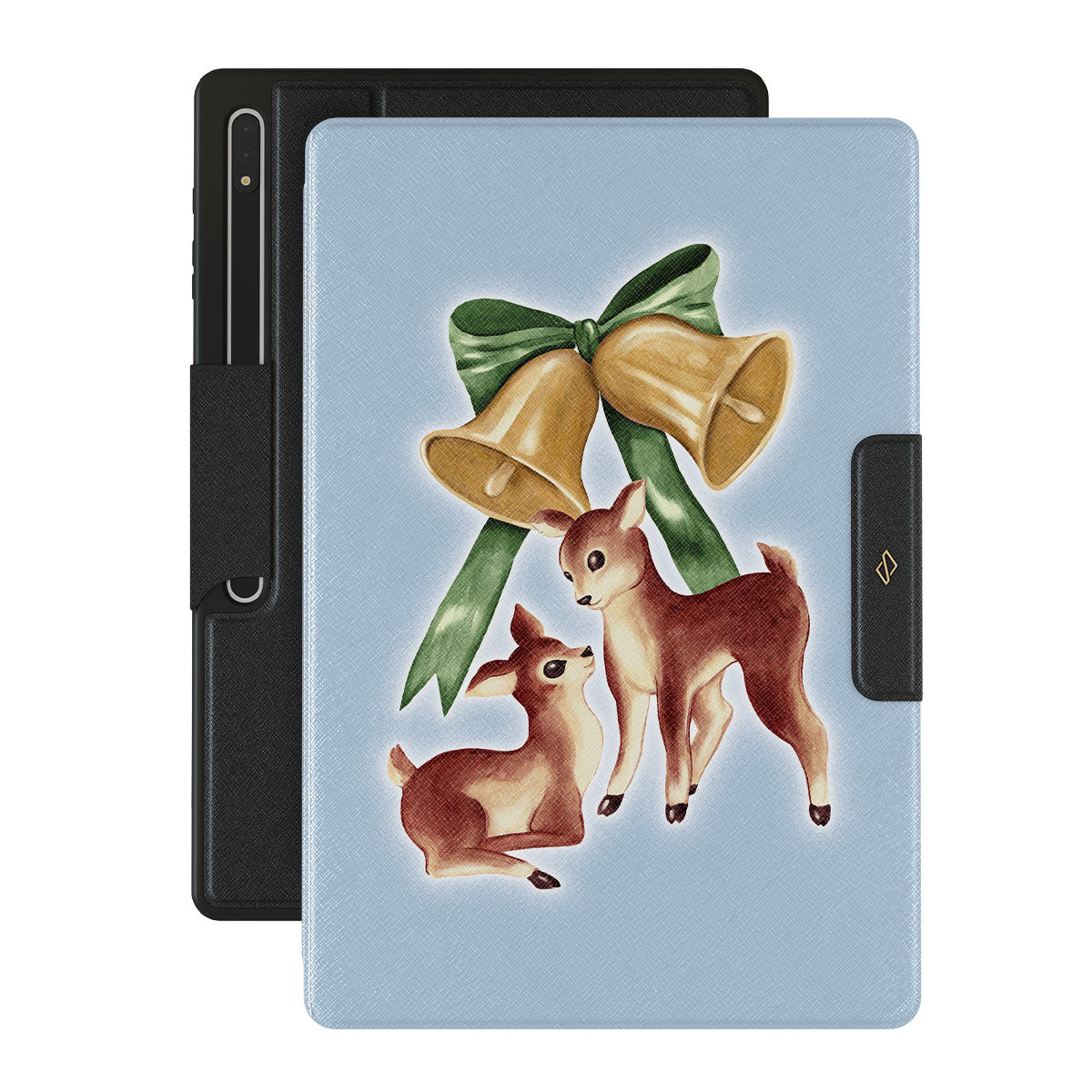 このデザインの特徴:ヴィンテージのトナカイ、クリスマスベル、金色のベル、レトロなトナカイのイラスト、ベビーディア、ライトブルーの背景