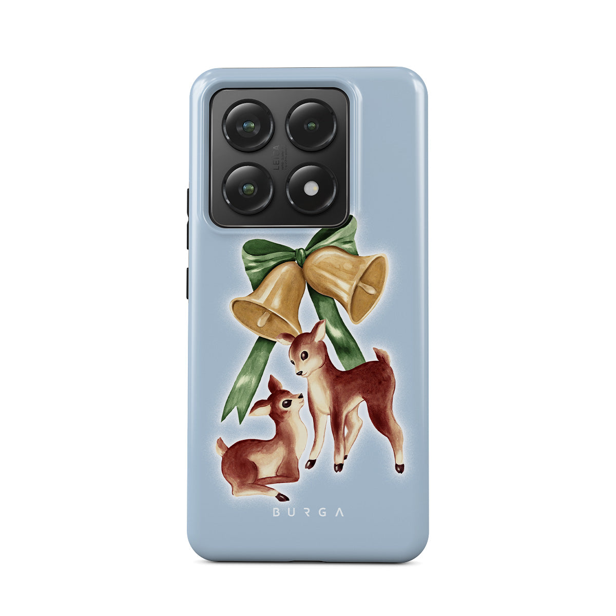 このデザインの特徴:ヴィンテージのトナカイ、クリスマスベル、金色のベル、レトロなトナカイのイラスト、ベビーディア、ライトブルーの背景