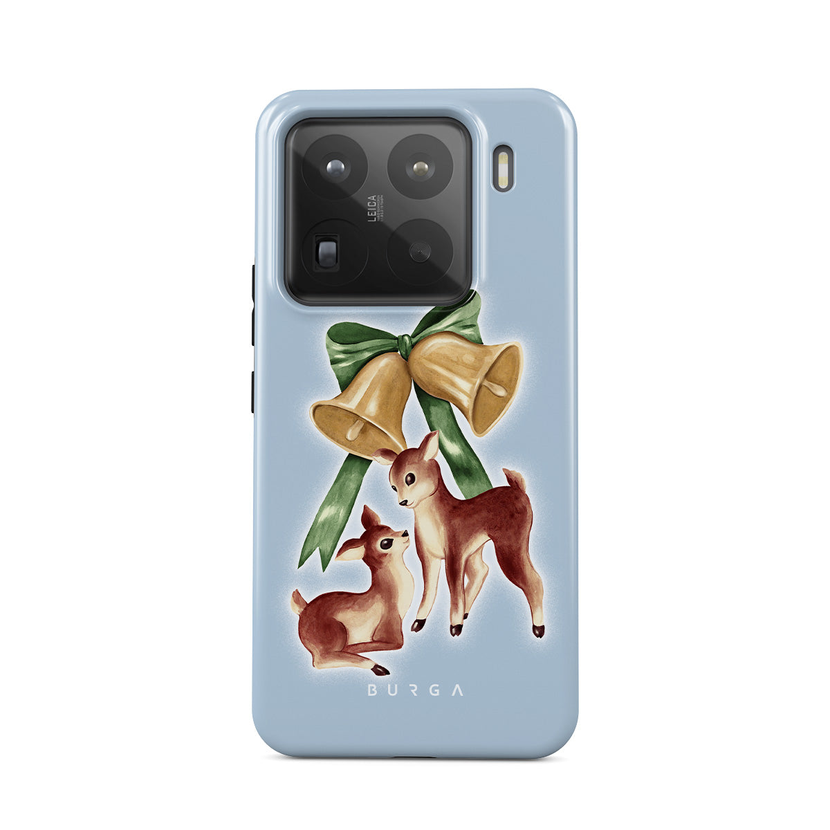 このデザインの特徴:ヴィンテージのトナカイ、クリスマスベル、金色のベル、レトロなトナカイのイラスト、ベビーディア、ライトブルーの背景
