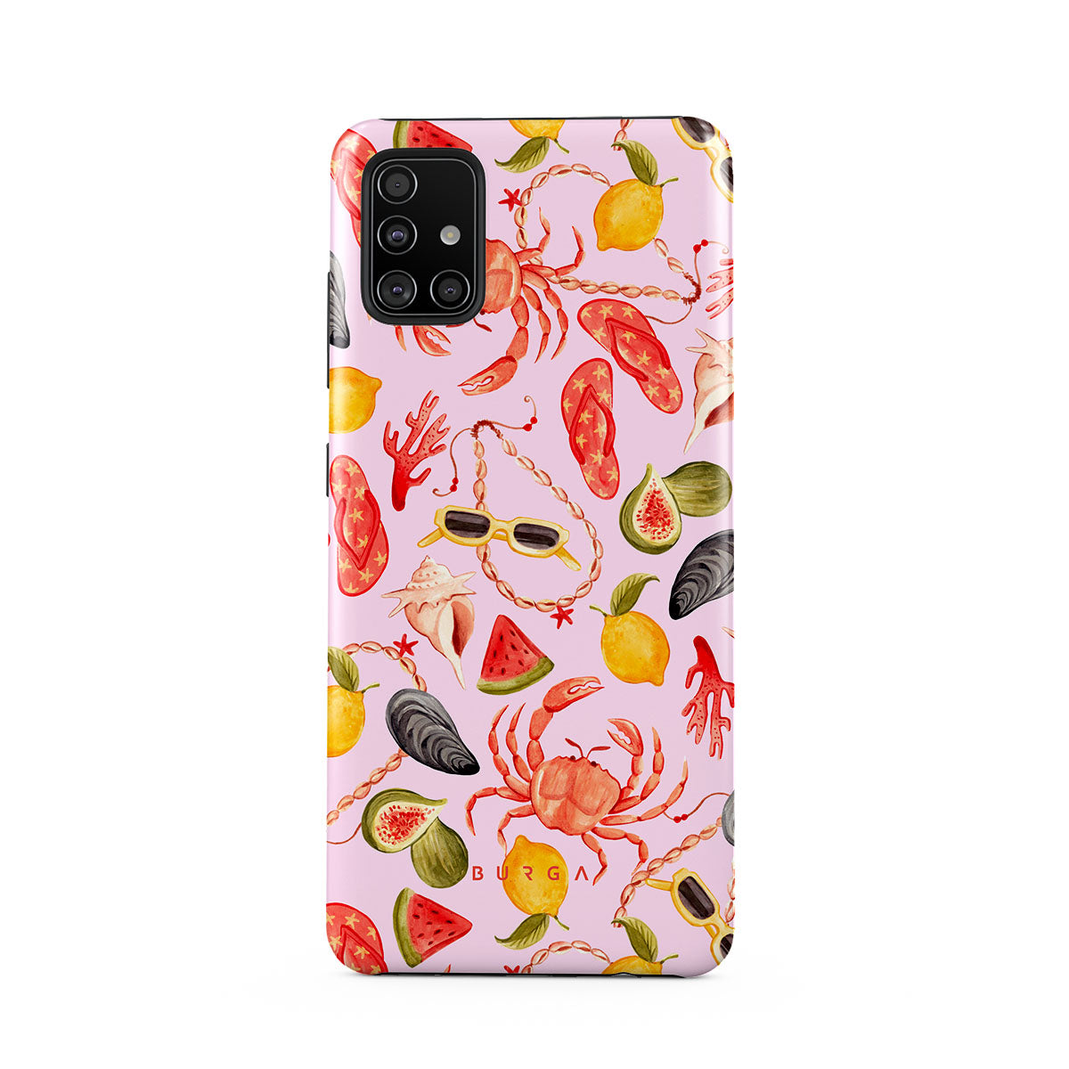 このデザインの特徴:スイカ、サングラス、シーフード、カニ、ビーチサンダル、牡蠣、レモン、鮮やかな色、トロピカルテーマ