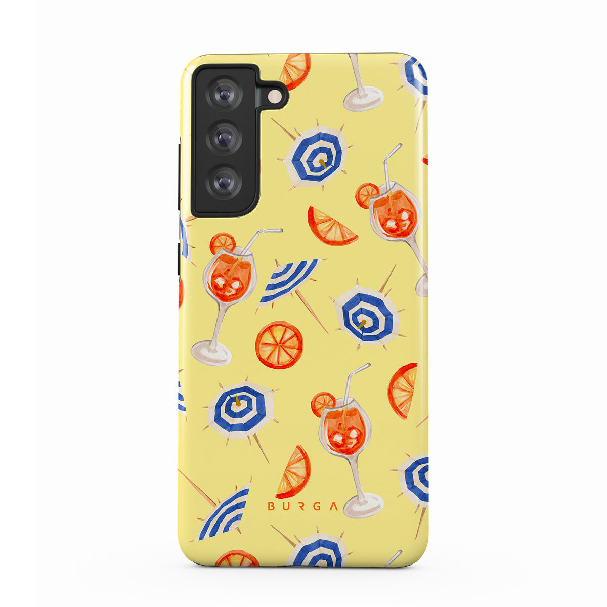 このデザインの特徴:ドリンク、カクテル、モクテル、オレンジ、ビーチ模様、傘