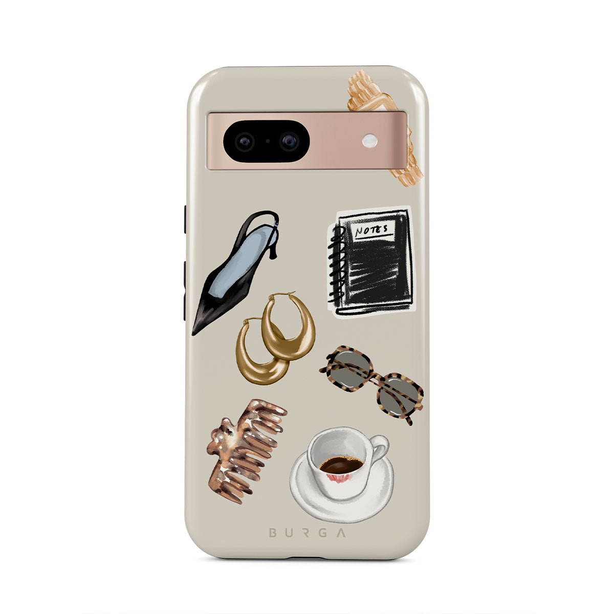このデザインの特徴:、黒いハイヒール、ゴールドのフープピアス、黒いノート、コーヒーカップ、べっ甲柄のメガネ、ブラウンのシュシュ、レトロなゴールドウォッチが含まれています。